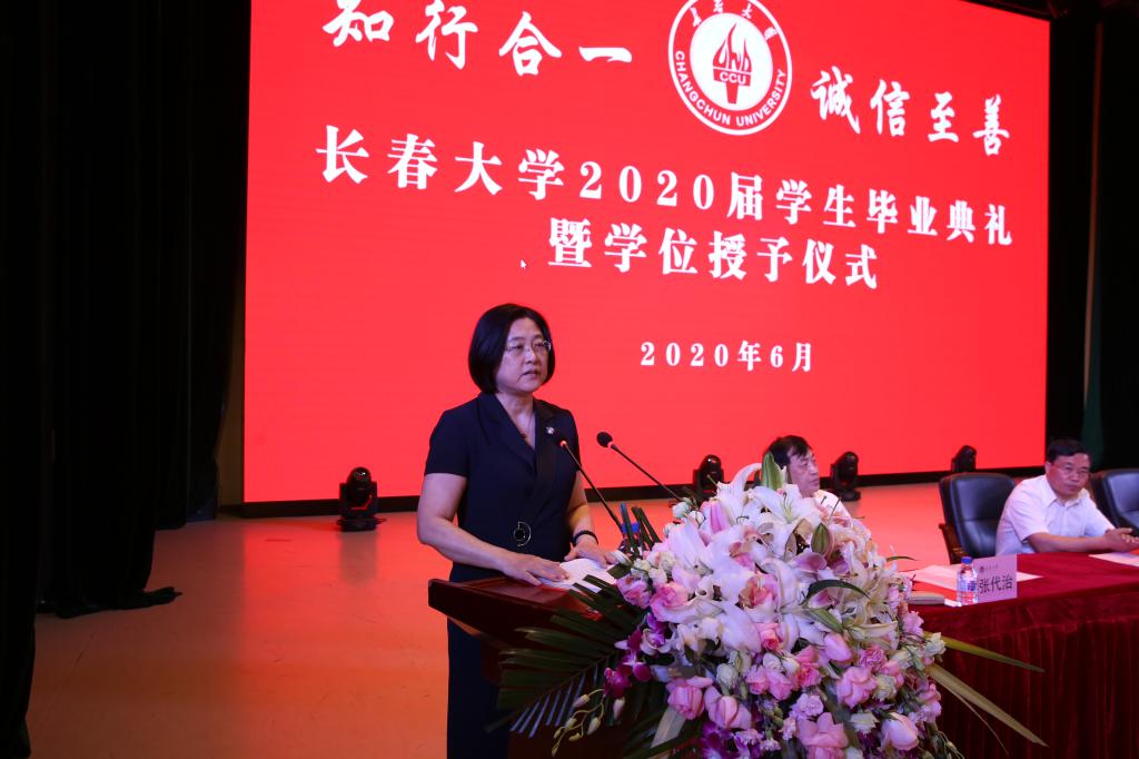 6月18日上午九时,长春大学2020届学生毕业典礼暨学位授予仪式在图书馆报告厅举行。学校党委书记孙爱军、校长李志瑶、党委副书记童猛、副校长王剑飞、纪委书记李廷吉、副校长陈煜平、副校长张代治出席典礼。各学院院长、教师代表、毕业班辅导员、2020届部分毕业生代表在现场参加典礼,2020届全体本专科毕业生、硕士毕业生通过钉钉直播在云端共同参加,典礼由中国吉林网全程直播。典礼由学校办公室主任张献主持。
